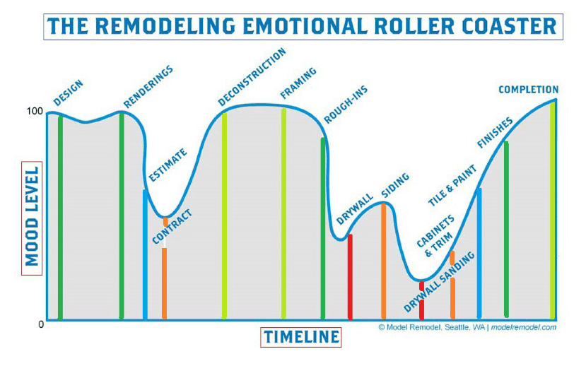 Remodeling, building and renovating your home, or just a small portion of it, is both exciting and a little unnerving for many homeowners. We spend the time and work very closely with each of our clients and do our best to reduce stress and mitigate feelings of uneasiness with good communication and proper planning. However, we've learned over the years that the clients' moods often change in direct correlation to where we are within the project. We then found this graphic from a remodeling company in Seattle (credit: Model Remodel Seattle, WA) that perfectly illustrates the emotional experience of many homeowners...even if they are thrilled with the completed project.